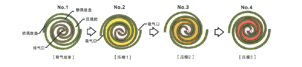 動(dòng)渦旋盤按照下圖NO.1 → NO.2 → NO.3 → NO.4的順序旋轉(zhuǎn),因此與點(diǎn)對稱的位置處的月牙形壓縮腔容量會(huì)逐步減小,氣體壓縮后從中心部的排氣口排出。